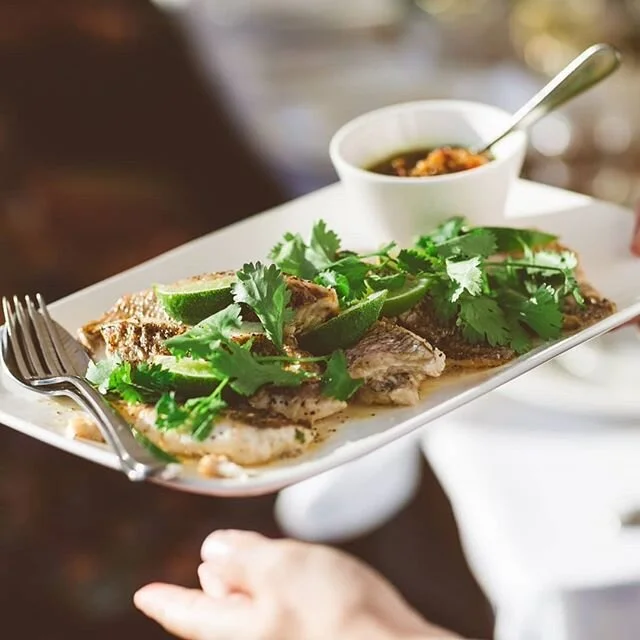 Seared fresh market fish with eggplant kasundi, fresh lime and coriander